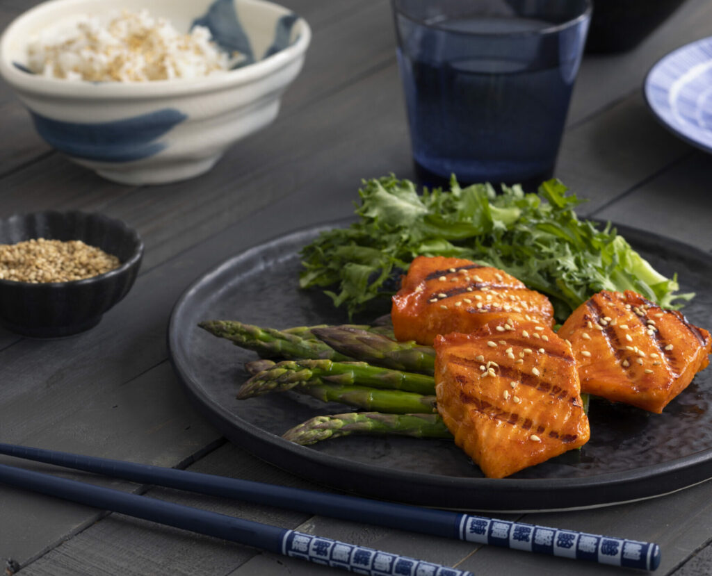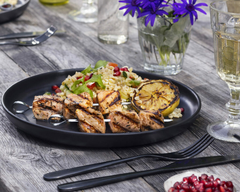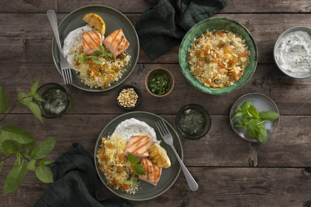 烤 Frøya 三文鱼配粗麦粉、酸奶酱配大蒜、薄荷和香菜
