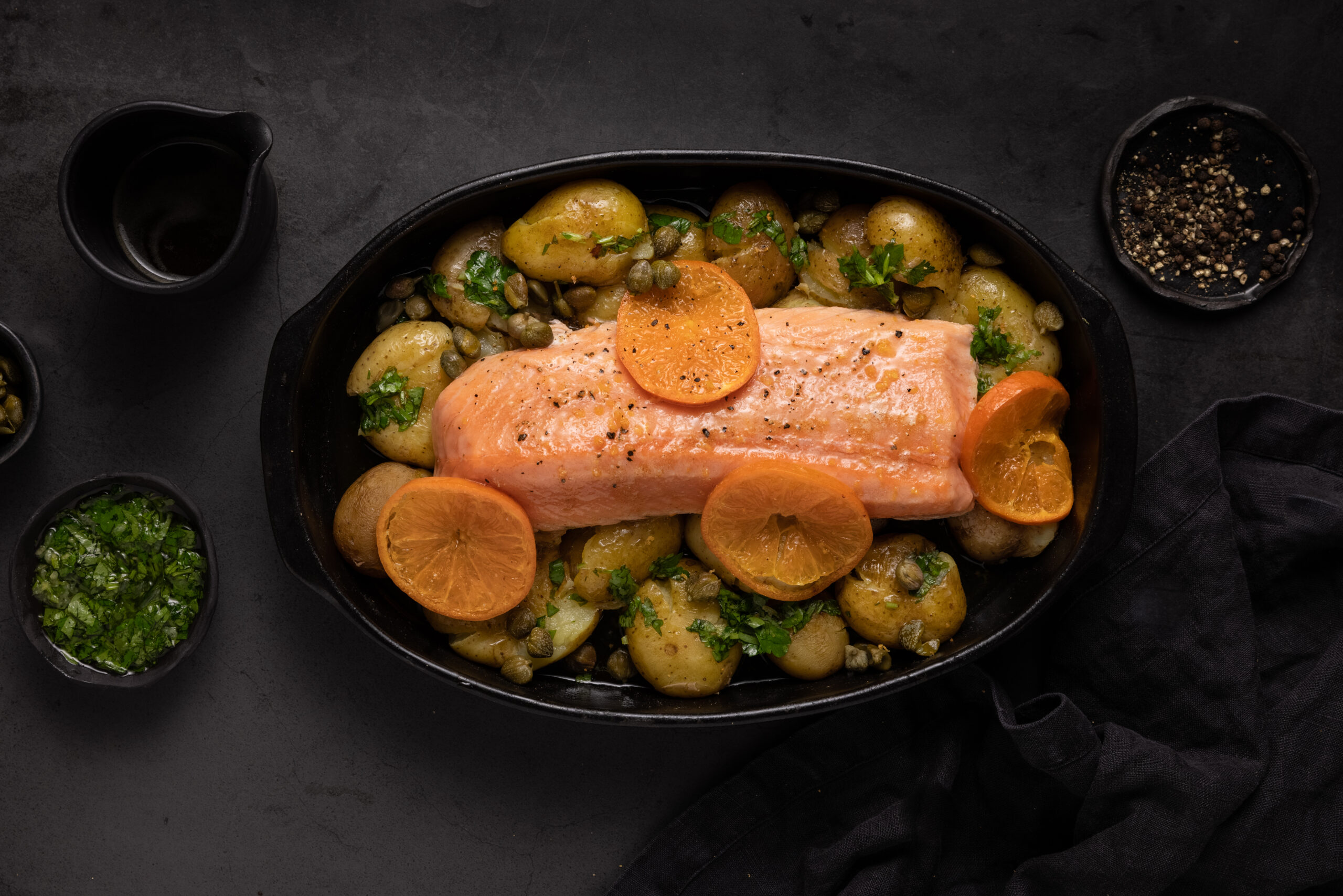 首页 食谱 焗Frøya三文鱼配黄油、酸豆和土豆 焗Frøya三文鱼配黄油、酸豆和土豆 40 分钟 中型 晚餐 说明 避免屏幕进入休眠状态 这样做 将烤箱温度调至 180 度 将黄油放入煎锅中煎约 4 分钟。将平底锅离火。加入酸豆、柠檬汁和柠檬皮。 将三文鱼放入已刷过油的烤盘中。将煎好的黄油倒在三文鱼周围。 将橙子片放入煎好的黄油中。 使用烹饪温度计将鱼烹煮至核心温度约 50 度。三文鱼的中心应呈红色/浅粉色。 马铃薯 马铃薯 将土豆煮至半软。 将烤箱预热至 200 度,最好是热风炉。 找一个烤盘,铺上烤纸,用叉子将每个土豆压实。将切碎的大蒜与油混合,刷在土豆上。 烤 20-30 分钟,直到土豆呈金黄色。土豆出炉后要加盐。 土豆做好后,与三文鱼一起放入模具中,上桌前撒上切碎的香菜。 本食谱中的产品 半 Frøya Mid Loin 300g