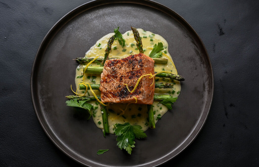 烤三文鱼配芦笋和白葡萄酒