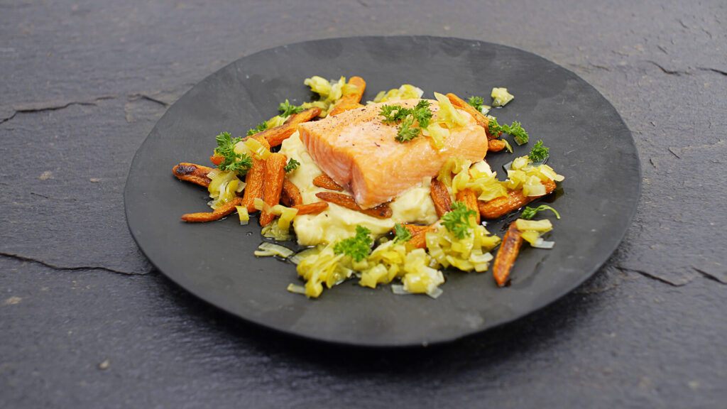 烤三文鱼配蔬菜和马铃薯奶油