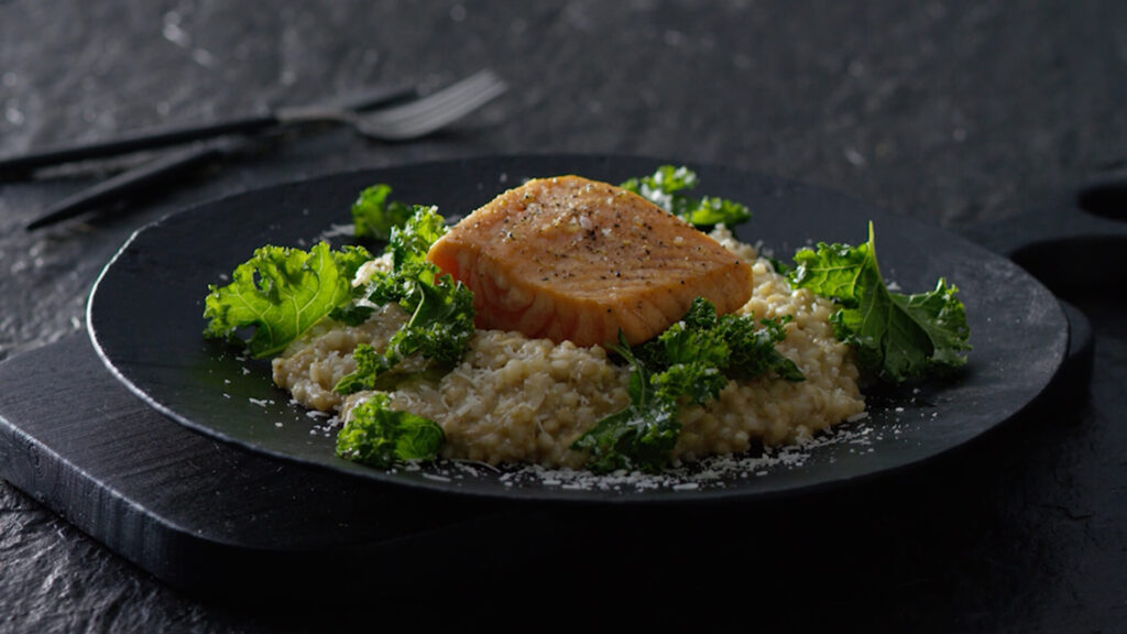 美味的三文鱼配羽衣甘蓝和大麦烩饭。
