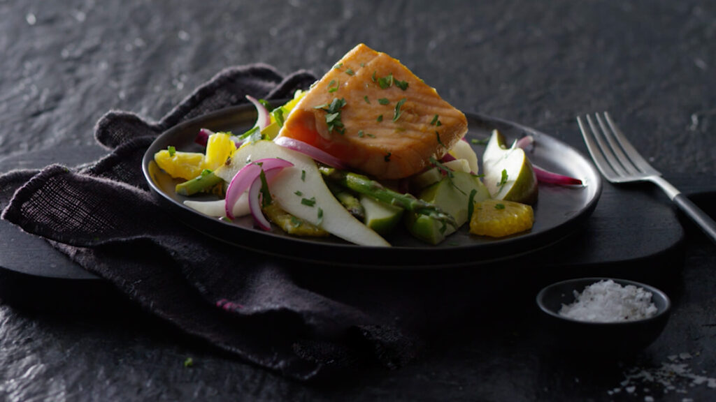 香煎三文鱼配橙色烤蔬菜和水果