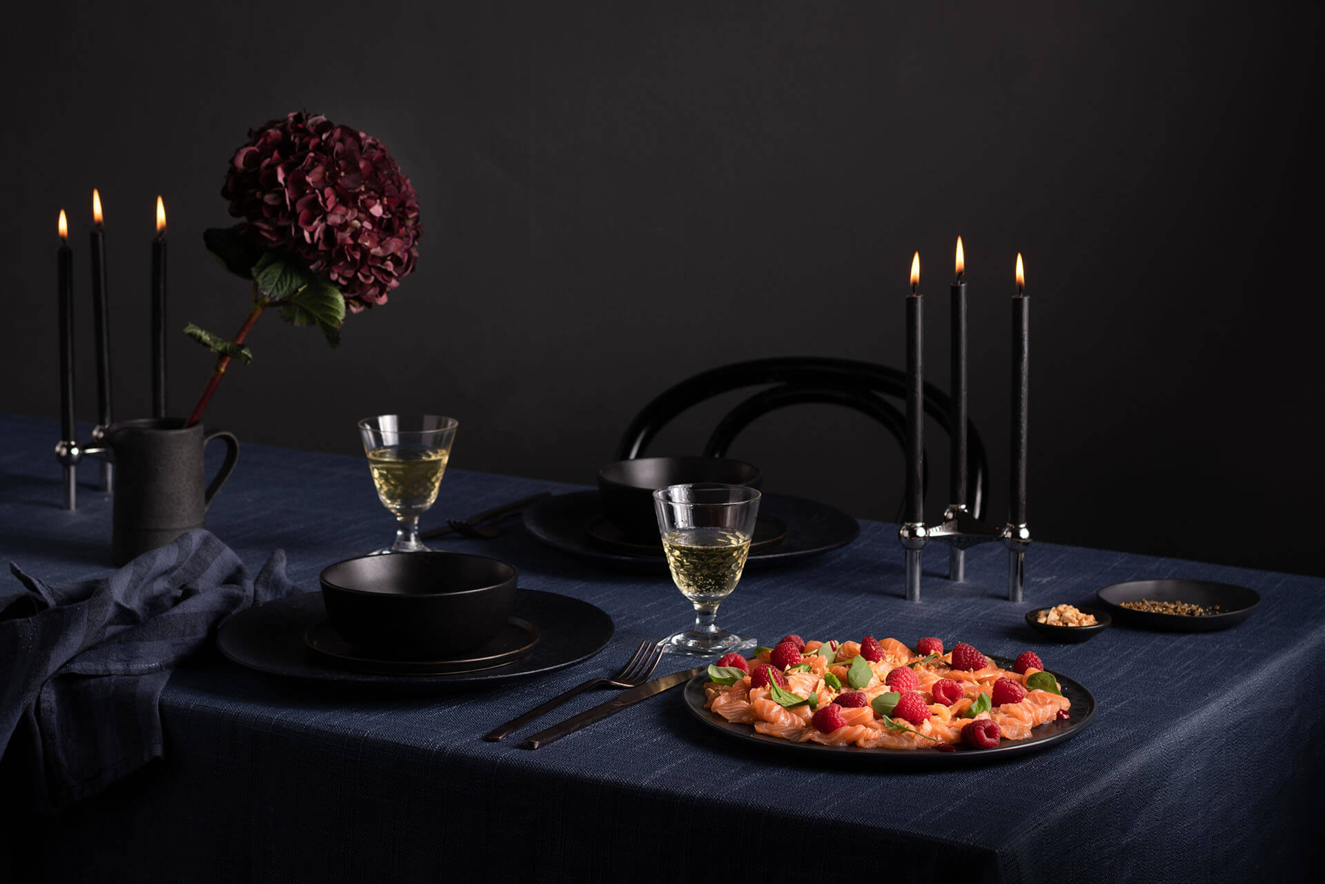 头盘配三文鱼刺身、菠菜和杏仁