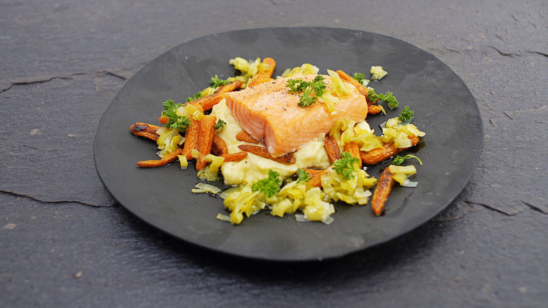 首页 食谱 Frøya 烤三文鱼 Frøya 烤三文鱼 20-40 分钟 中型 晚餐 说明 避免屏幕进入休眠状态 程序 将烤箱加热至 220 ℃。 将杏仁土豆去皮,煮约 20 分钟直至变软。 将小胡萝卜/红萝卜放入烤盘中,加少许油、盐和胡椒粉。放入烤箱烘烤约 25 分钟。 将韭菜切成细末,在平底锅中加入少许油煎炸,直至韭菜变软发亮。然后挤上橙汁、半个柠檬汁和橄榄油。 将三文鱼切成小块,加入少许盐和胡椒调味。将三文鱼放入烤箱烤 6-8 分钟。 杏仁土豆变软后,滤去水分,用牛奶、芥末和黄油将土豆捣碎。 用盐和胡椒调味。切碎一些香菜,上桌时撒上。
