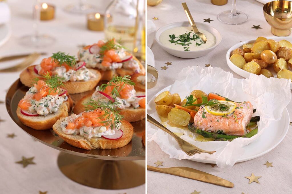 开胃菜三文鱼奶油吐司 // 主菜Papillottes 配烤 Frøya 三文鱼、香槟酱和柠檬土豆